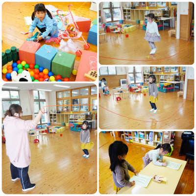 さて、幼稚園をのぞいてみると、年中さんたちが元気一杯に長なわ跳びに挑戦していました。跳べた回数が増えるたびに、うれしそうに「なわとびカード」にシールを貼りに行き、繰り返し練習していました。